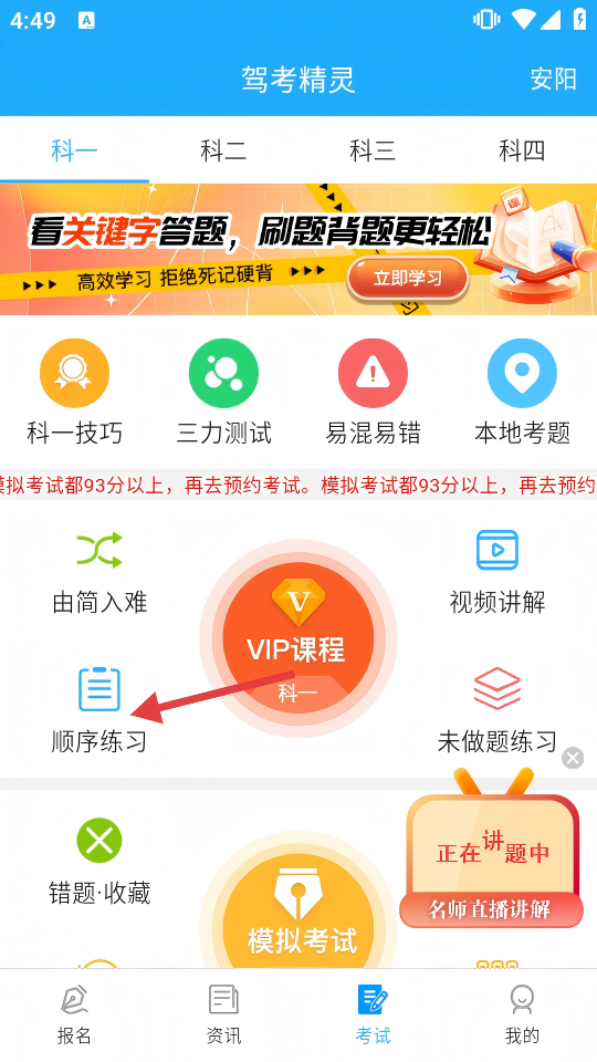 2、在【驾考精灵】科一界面,点击【顺序练习】,进入练习模块,可系统学习科一试题。