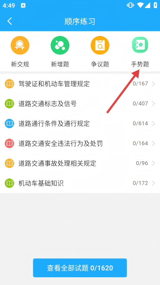 3、在【顺序练习】页面,点击【手势题】,可专项练习交通警察手势相关试题。
