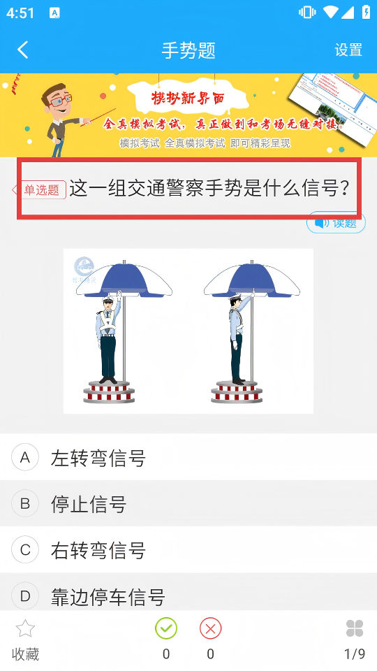 4、做【手势题】时,观察交通警察手势动作,如左臂向前上方直伸掌心向前,对应选择【停止信号】等正确答案,巩固手势题知识。