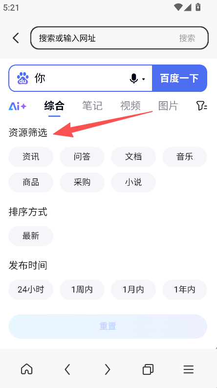 3、使用资源筛选功能,可分类筛选资讯、问答等不同类型资源。