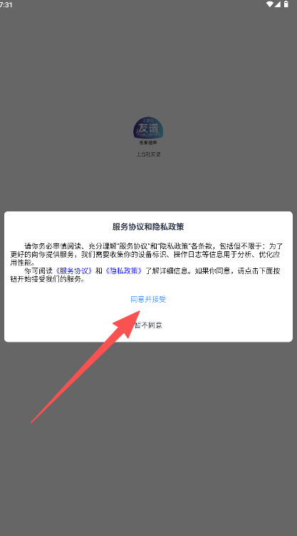 1、首次打开应用时,在服务协议弹窗中阅读条款后,点击“同意并接受”。