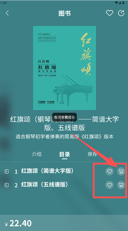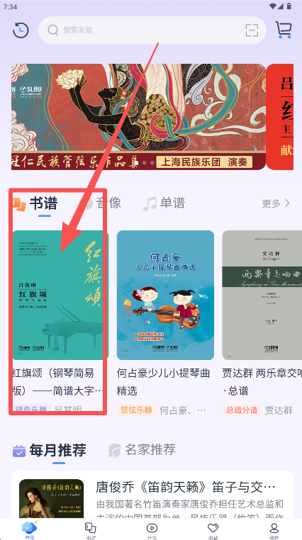 2、进入首页后点击“书谱”分类,浏览并选择目标如《红旗颂(钢琴简易版)》。