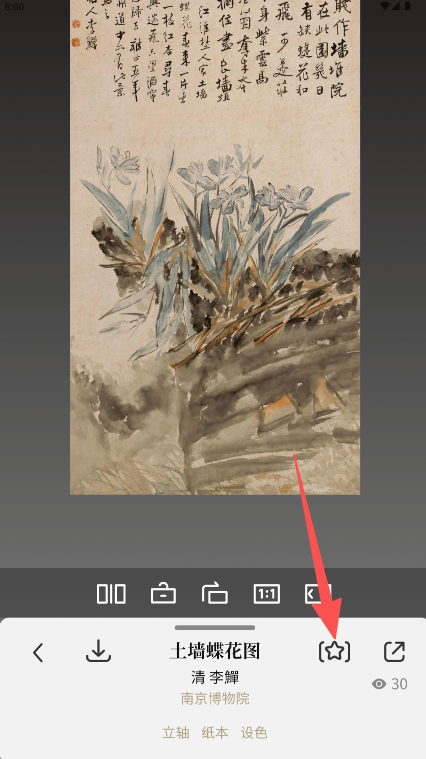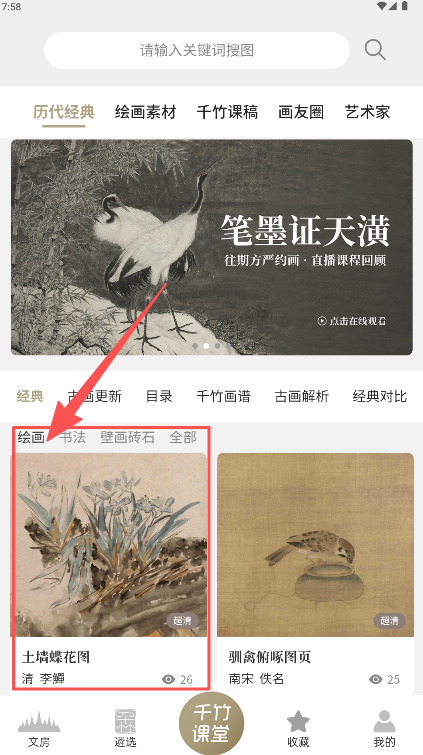 1、在首页“绘画”分类中浏览作品缩略图,点击《土墙蝶花图》进入详情页。