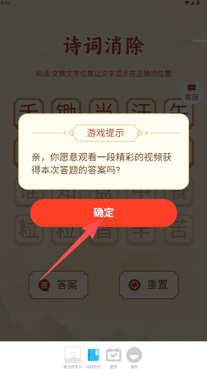3、当弹出“游戏提示”窗口时,点击“确定”按钮观看视频以获取本题答案。