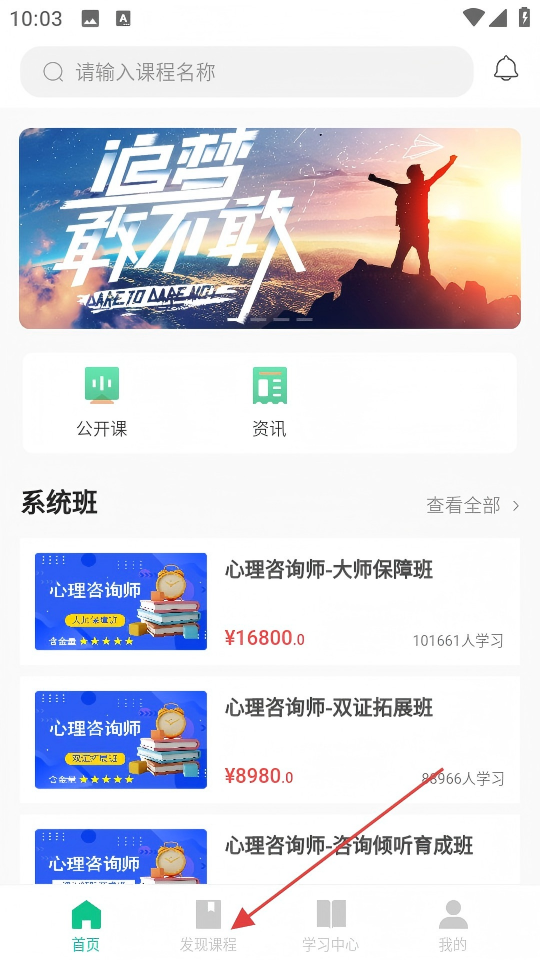 1、在首页底部点击【发现课程】,进入发现课程页面。