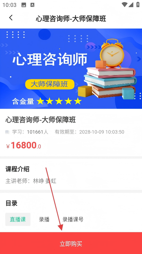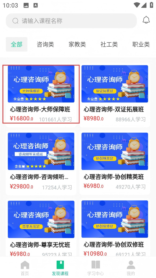 2、在发现课程页面选择“心理咨询师-大师保障班”课程,进入课程详情页面。