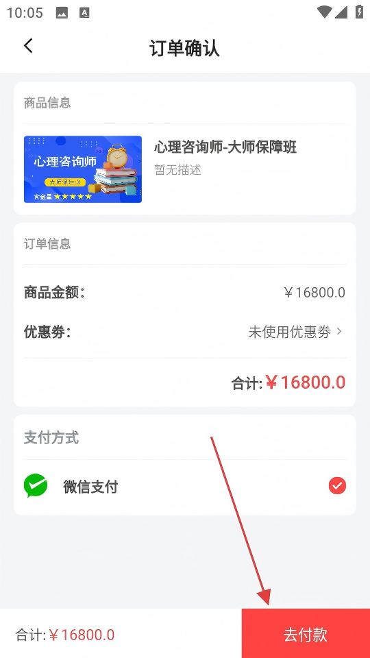 4、在订单确认页面点击【去付款】,完成课程购买的支付流程。