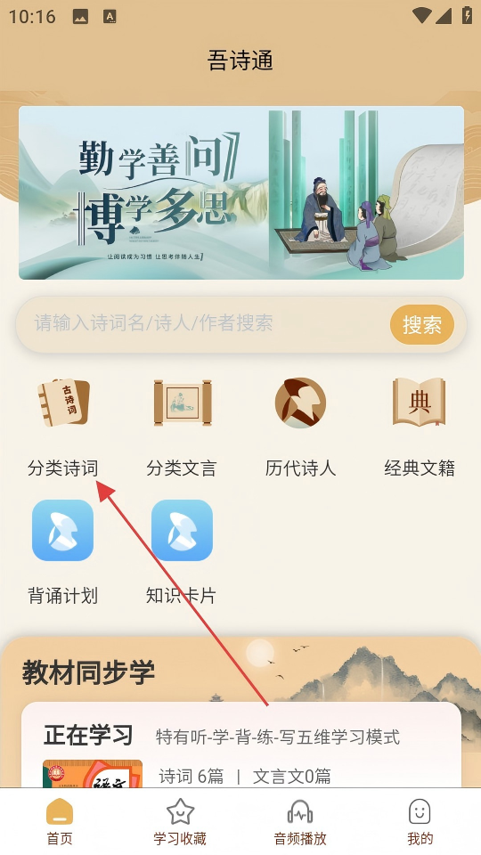 1、在首页点击【分类诗词】,进入分类诗词页面。