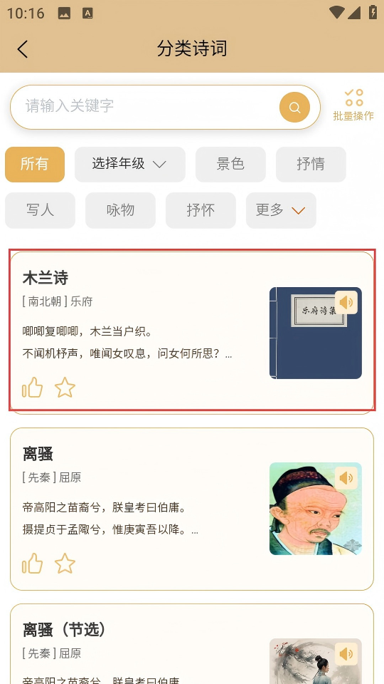 3、具备高清音频播放功能,可一键收听诗词内容,支持收藏喜欢的音频与自定义播放顺序,满足听学需求,提升学习沉浸感。