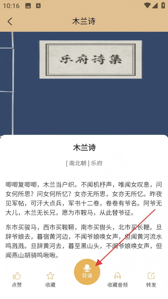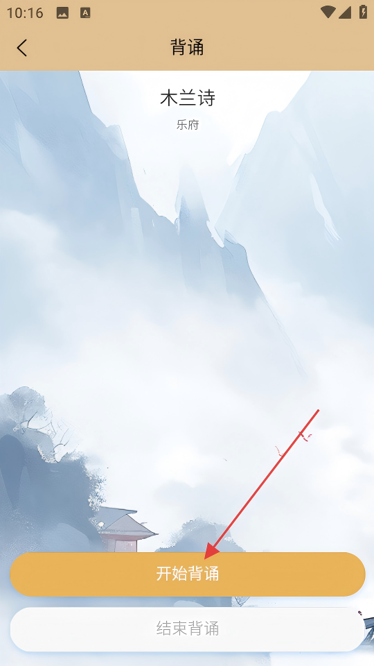 4、在背诵页面点击【开始背诵】,即可开始《木兰诗》的背诵练习。