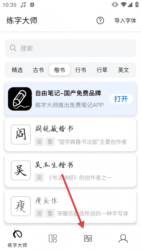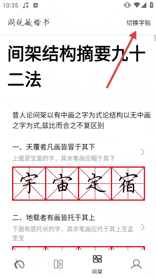 2、在间架结构页面点击【切换字帖】,进入字帖选择页,可切换不同字体字帖。