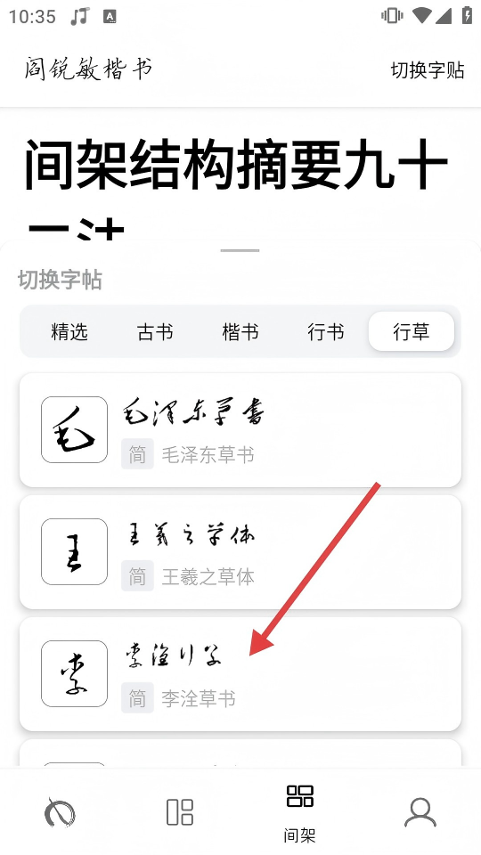 3、在字帖选择页选择目标字帖(如李淦草书),进入对应字帖的学习页面。