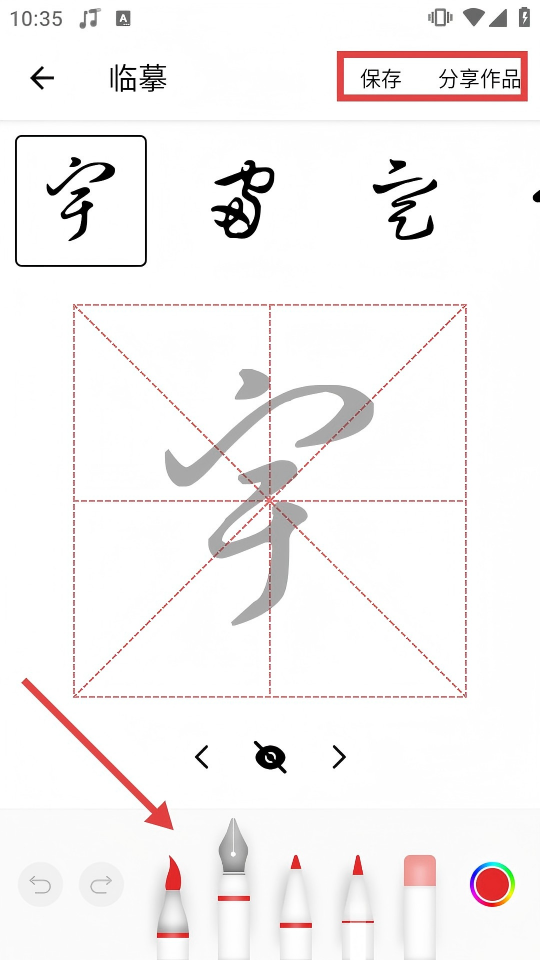 4、在临摹页面选择笔刷,完成临摹后可点击【保存】,保存练字作品。