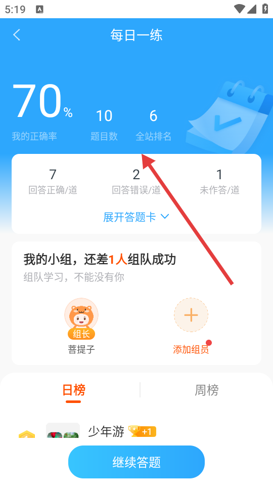 4、完成答题后,可查看正确率、题目数、全站排名等答题数据。