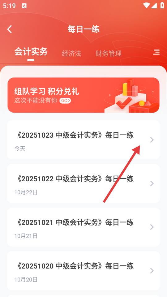 2、在每日一练板块,选择当天的练习条目,如《20251023-中级会计实务》每日一练。