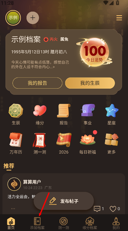 3、支持缘分测算与合婚分析,根据双方出生时间计算契合度,呈现匹配指数与关系建议。