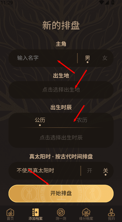 2、在档案页面中输入姓名与出生日期等内容,确认无误后进行排查分析。