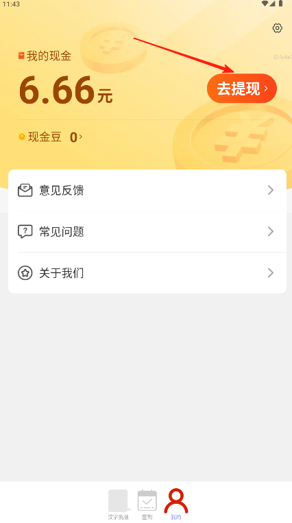 2、通过每日签到与完成关卡,可积累我的现金点击“去提现”。