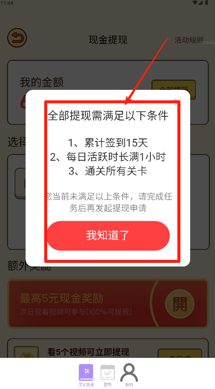 3、满足签到天数、活跃时长与通关条件后,即可申请提现。