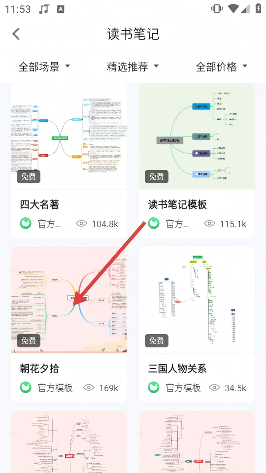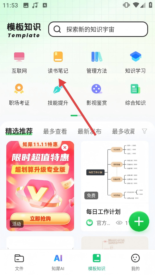 1、在模板知识页面点击【读书笔记】,进入读书笔记模板列表页。