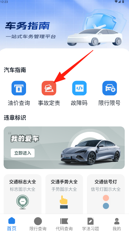 1、在软件首页的“汽车指南”区域找到并点击“事故定责”功能图标。