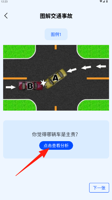 2、进入“图解交通事故”界面查看案例图示与描述并点击“点击查看分析”。