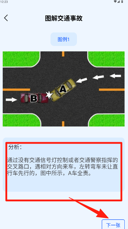 3、阅读详细的责任判定规则分析后点击“下一张”可继续学习其他案例。