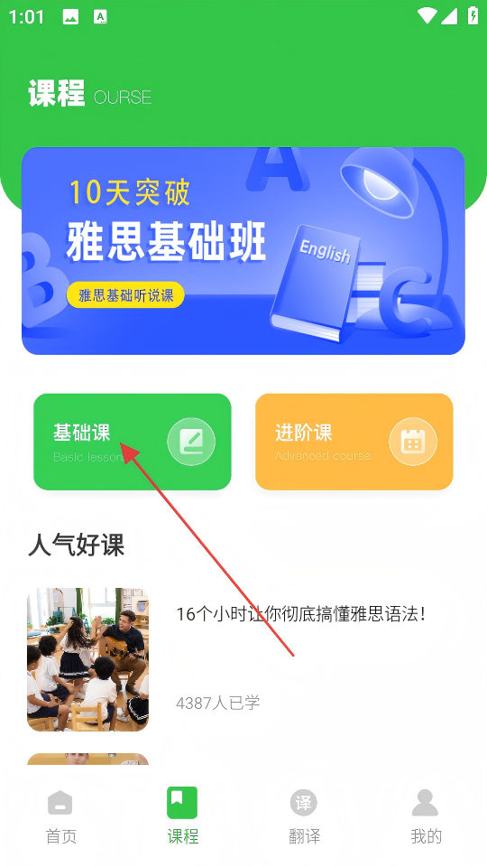 2、在课程页面点击【基础课】按钮,进入基础课列表页面。