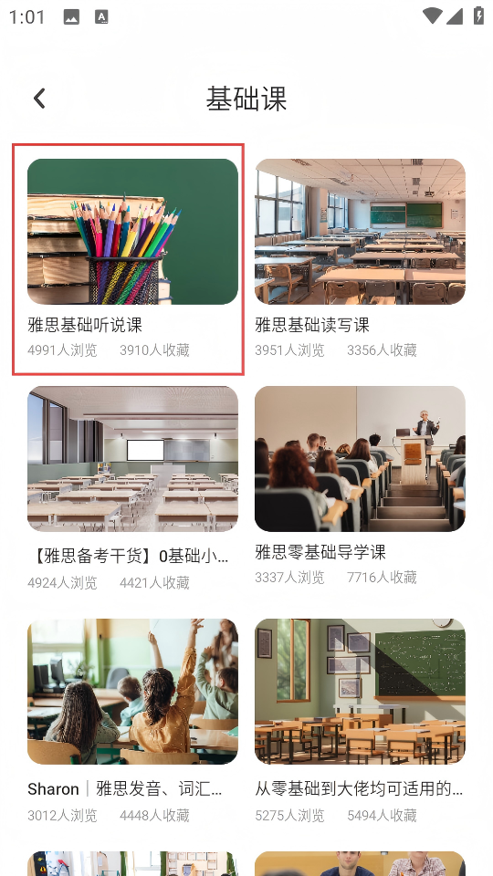 3、在基础课列表中点击【雅思基础听说课】,进入该课程的详情页面。