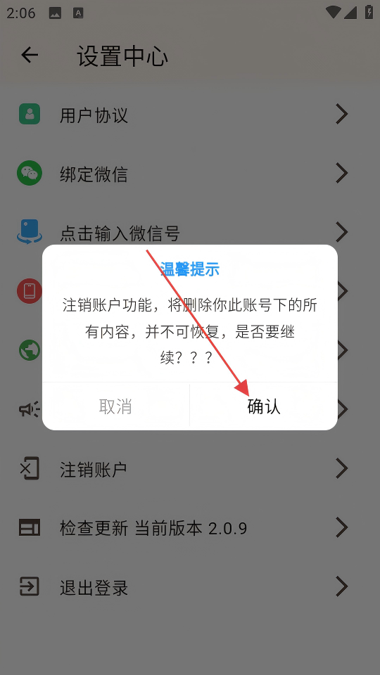 4、在温馨提示框中点击【确认】按钮,即可完成账户注销操作。
