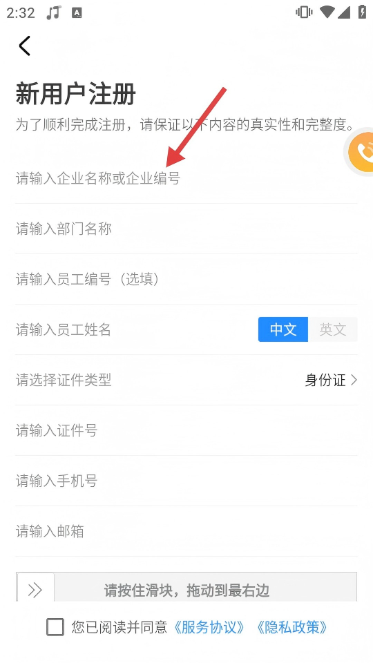3、在新用户注册页面填写【企业名称或企业编号】【部门名称】【员工姓名】等信息,并完成滑块验证。