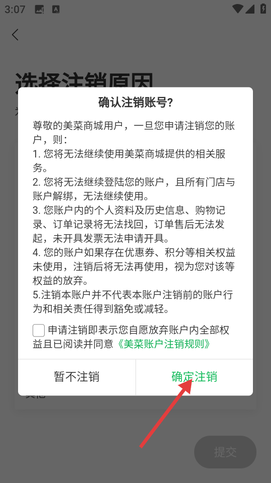 4、在注销账号确认页面,勾选同意条款后点击【确定注销】按钮,可完成账号注销操作。