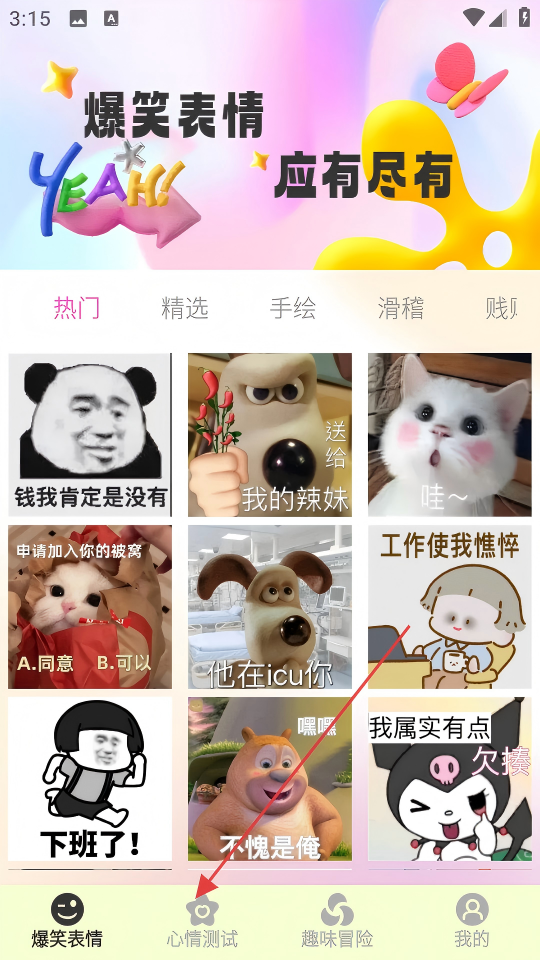 掌尚笑果是一款专注于提供娱乐社交服务的多功能趣味工具,集爆笑表情、心情测试、聚会游戏等核心功能于一体,通过表情包资源整合与互动娱乐设计,助力用户轻松提升社交趣味性与情绪管理能力。它整合海量爆笑表情包资源,按滑稽、手绘、贱贱等主题精细分类,支持一键下载与实时斗图,满足用户在聊天场景中的多样化表达需求。