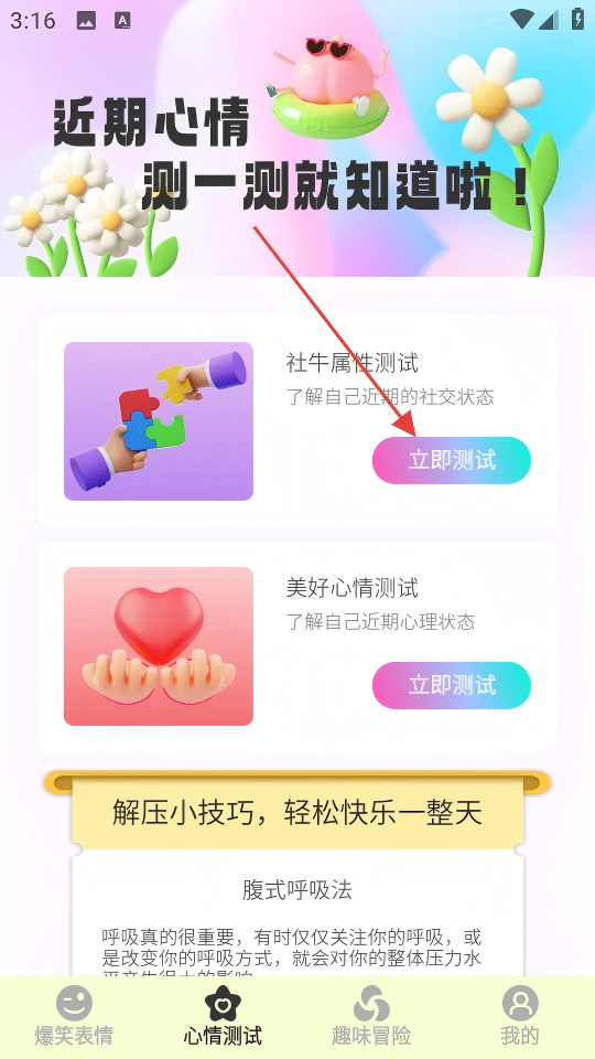 2、进入主界面后,点击底部【心情测试】按钮,进入心情测试页面。