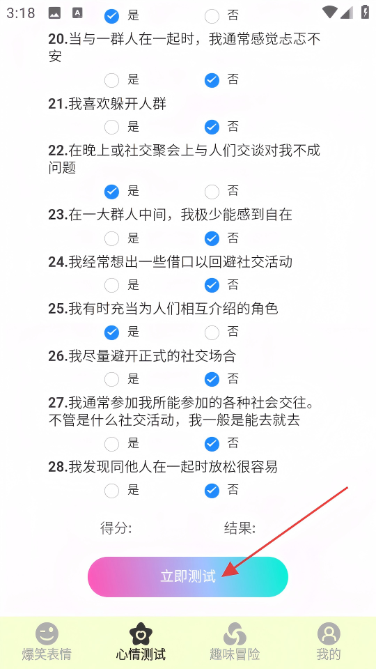 3、在心情测试页面,点击【社牛属性测试】的【立即测试】按钮,进入测试题界面。