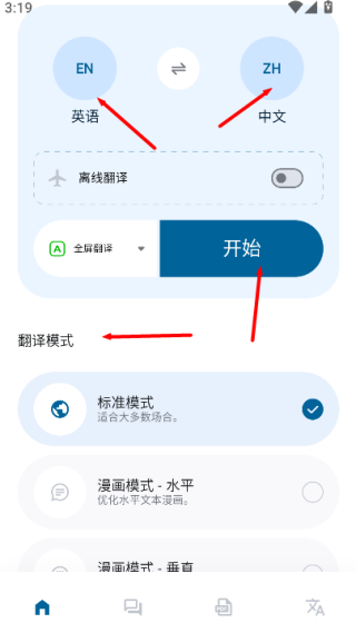 1、打开软件后,先选择需要翻译的语言和翻译模式,然后点击开始按钮进入翻译界面。