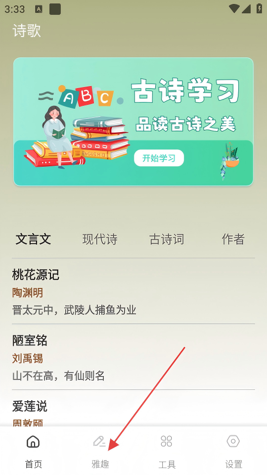 1、在软件界面点击底部【雅趣】按钮,进入雅趣页面。