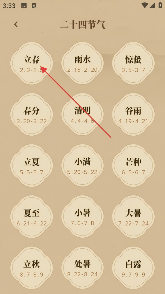 3、在二十四节气列表页面点击【立春】,进入立春详情页面。