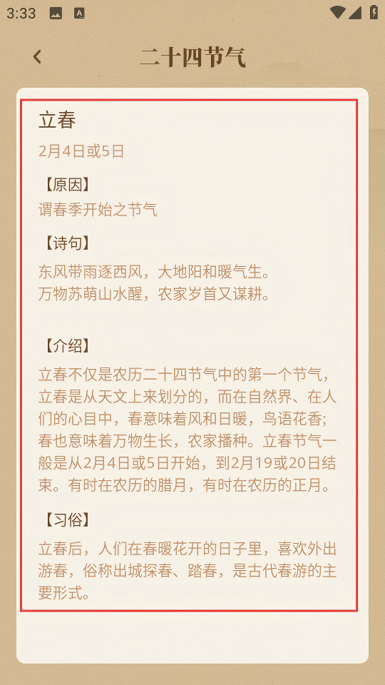 4、在立春详情页面,可查看【立春】的原因、诗句、介绍及习俗等文化内容。