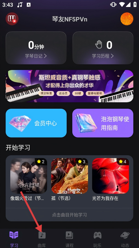 1、点击底部【曲库】,进入曲库页面,可查看各类弹奏分类和曲目。