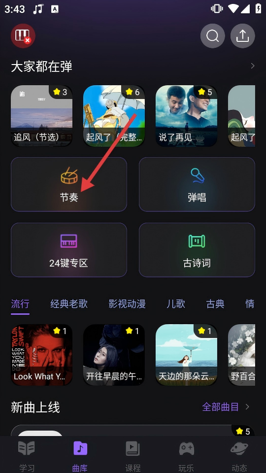 2、在曲库页面点击【节奏】,进入节奏曲目列表页。