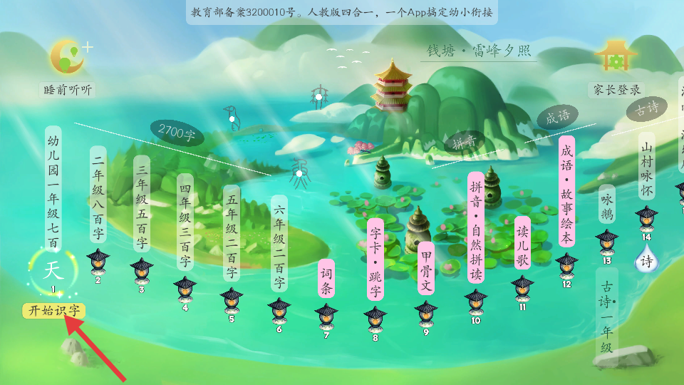 2、在识字地图页面,点击【开始识字】按钮,可进入人教版一年级(上)识字内容页面。
