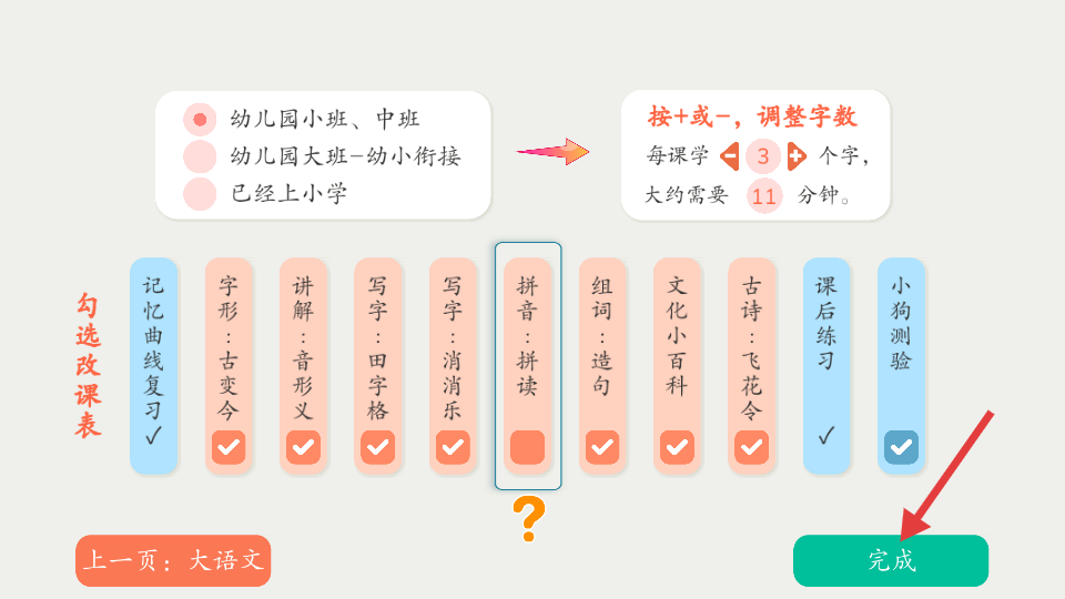 1、采用古诗顺序编排汉字学习进程,每完成一组学习就能流畅朗读古诗,建立即时反馈机制,增强孩子的学习成就感与积极性。