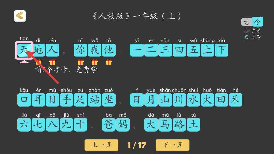3、在识字内容页面,点击要学习的汉字,如【天】,可进入该汉字的学习环节。