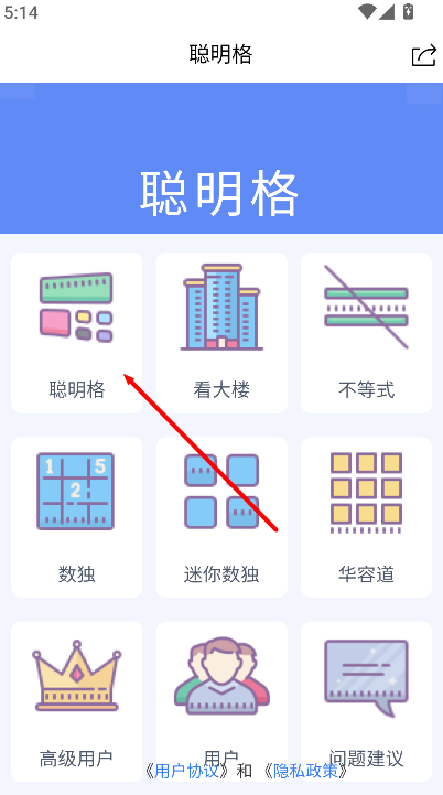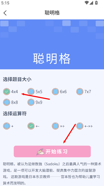 1、点击进入聪明格,打开软件即可看到题目选择和练习入口。