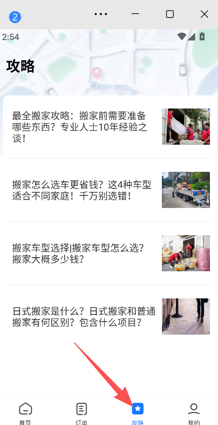 1、具备攻略查阅功能,提供大量搬家攻略文章,用户可随时查看搬家准备、车型选择、服务区别等知识,获取搬家信息。