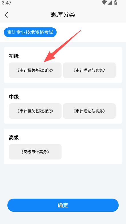 1、进入题库分类,选择初级、中级或高级审计考试科目。