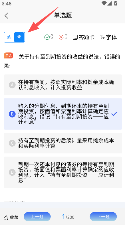 2、进入单选题页面,选择练或背模式进行题目练习。