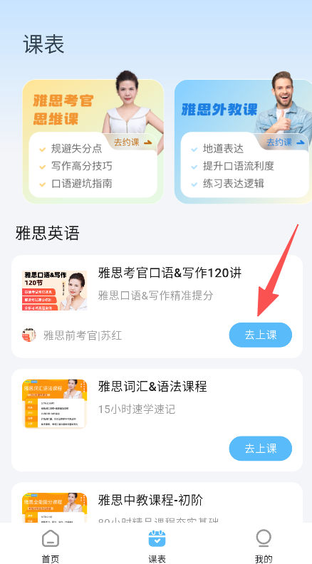 1、打开软件,进入课表板块,选择雅思英语课程点击去上课。