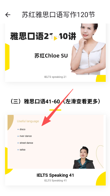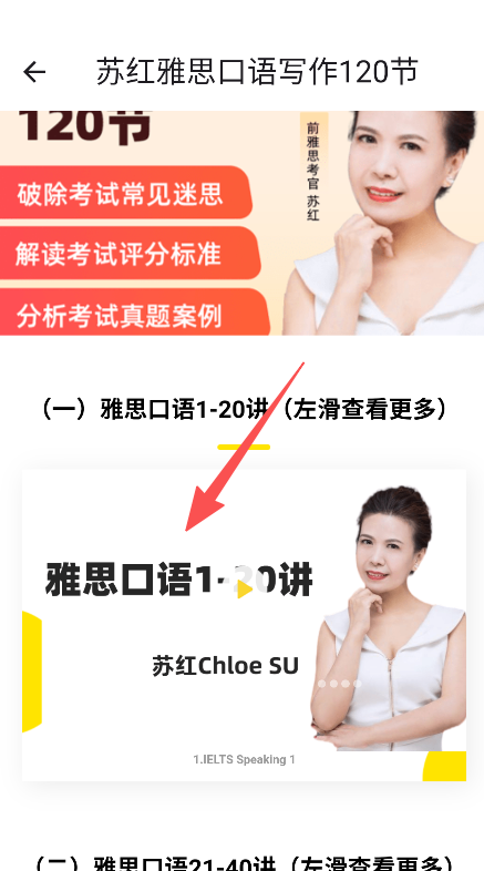 3、进入课程系列后,选择具体课程章节如雅思口语1-20讲等开始学习。